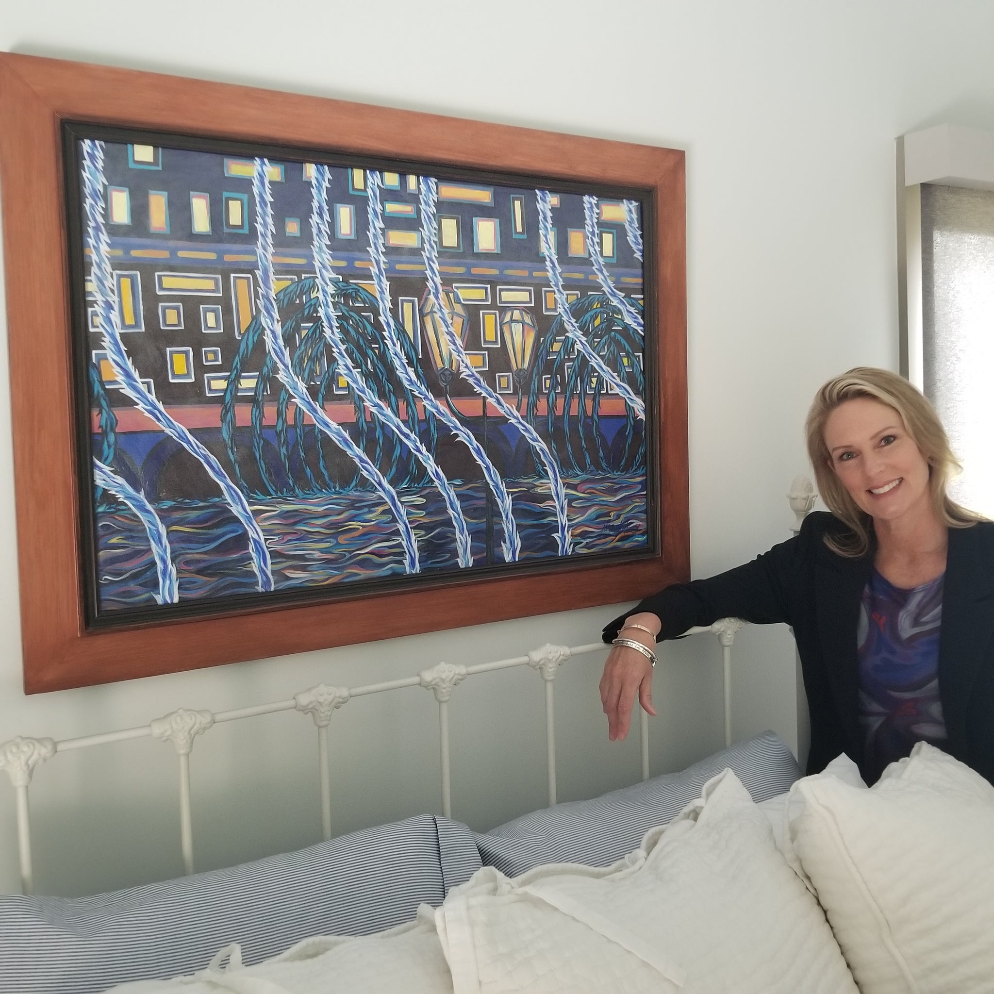 A colorful and lively abstract piece painted in 2008 on a trip to Las Vegas. The Fountains of Bellagio! This piece is acrylic on wood panel at 36" wide and 24" tall. It is frame to 42.75" wide and 30.75" tall.